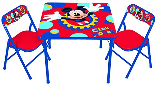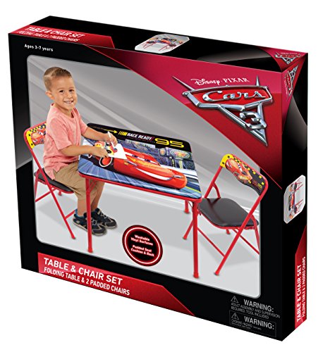 Your child can have hours of fun with this Disney Cars 3 activity table set. The set includes 1 table and 2 padded chairs. Bright colorful graphics & large table surface for drawing, eating & playing. Vinyl surface is washable and is made of sturdy metal tubular construction. Adult assembly required with included tool. Chairs include a safety locking mechanism. Chairs have a recommended weight limit of 70 lbs. For ages 3+Feature
