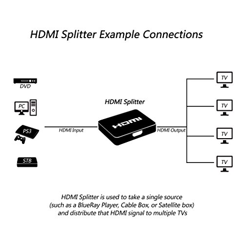 PLEASE NOTE - This is an HDMI Splitter is used to take a single source (such as a BlueRay Player, Cable Box, or Satellite box) and distribute that HDMI signal to multiple TVs. A splitter should not be confused with an HDMI SWITCH (which is used to connect multiple HDMI source devices to a single TV).