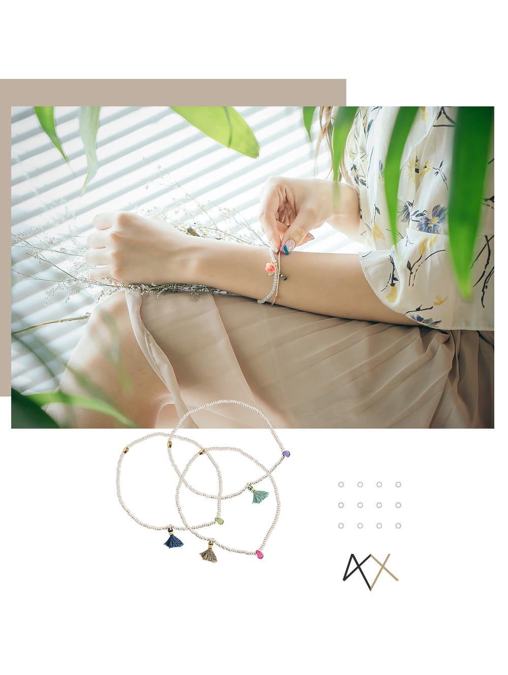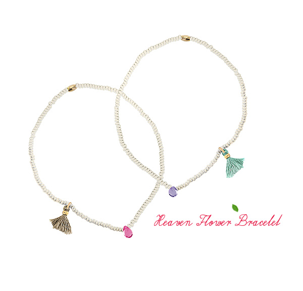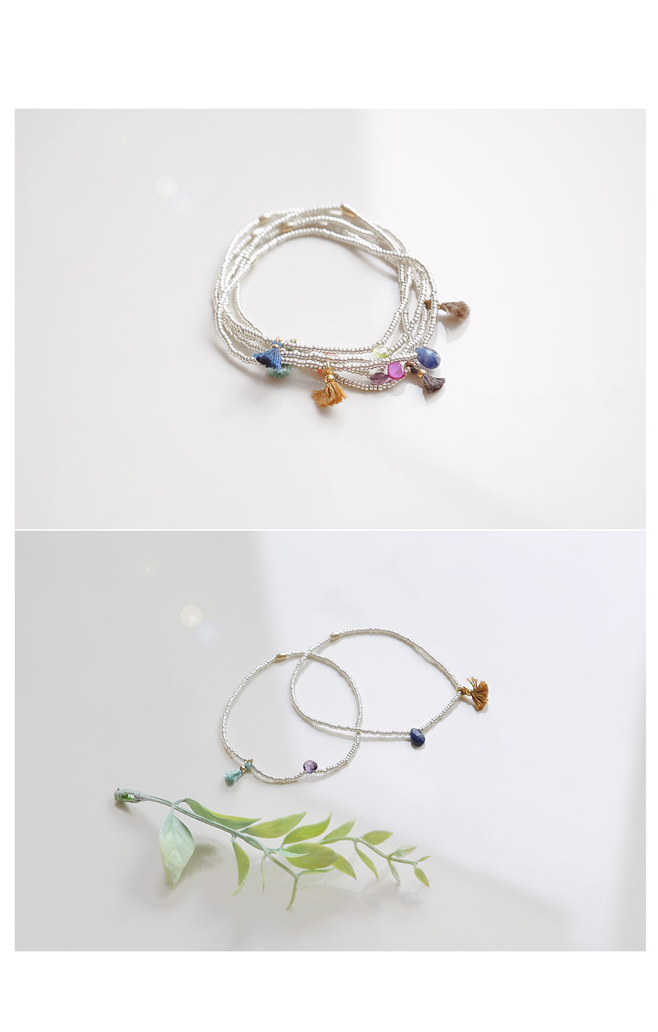 화사하고 깨끗한 느낌의 비즈에 태슬과 원석이 장식되어 있는 팔찌.
