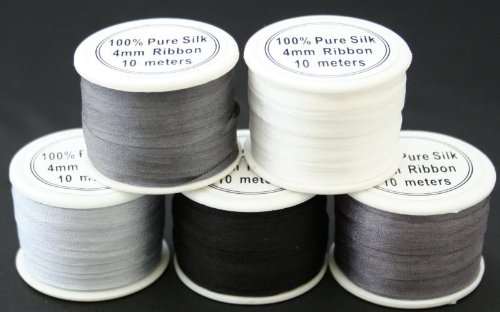 New ThreadNanny 5 Spools of 100% Pure Silk Ribbons - GREY Tones - 50 mts x 4mm