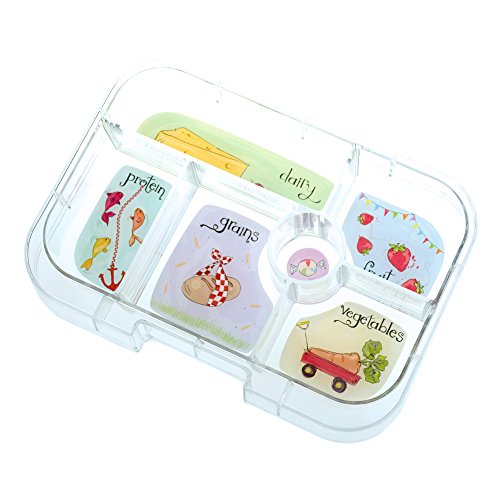 Yumbox is leakproof! Pack wet foods like yogurt and applesauce (not water). Seals with one lid. Kid-friendly latch. Removable tray with whimsical themed illustrations holds five 1/2 cup portions (i.e., 2 1/2 cups plus dip in round well).