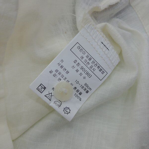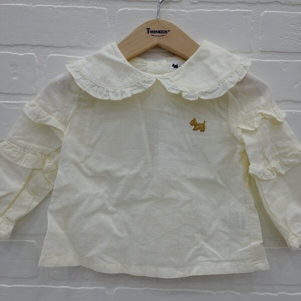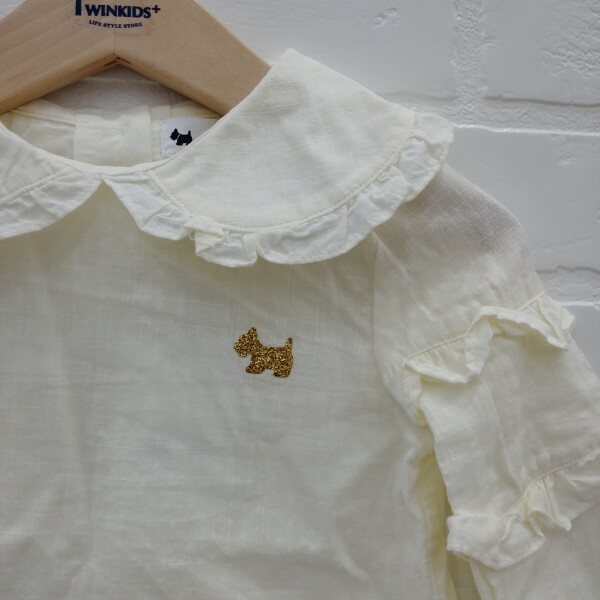 카라와 소매에 프릴장식으로 포인트를 준 여아 블라우스, 골드아가타 아플리케 자수가 가슴에들어감.