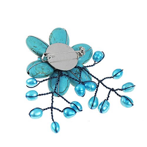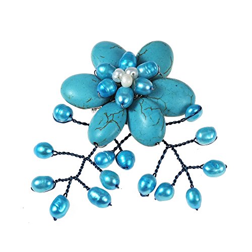 -. Feature : Material: Blue jewelry wire, Stainless steel metal / Stone: Reconstructed turquoise, Cultured freshwater pearls (dyed) / Design Measurements: 52 mm (2.05 in) at widest x 70 mm (2.76 in) long / Style: Pin/Brooch | Pearl Grade: B-C / Color: Blue-Turquoise | Weight: 23.4 grams