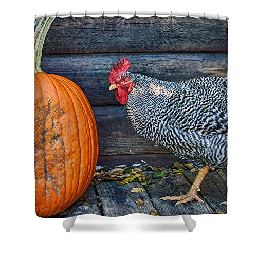 -. Title : Pixels Artistic Shower Curtain featuring "The Rooster And The Pumpkin #1" by Nikolyn McDonald
