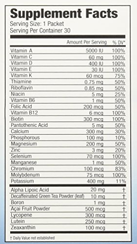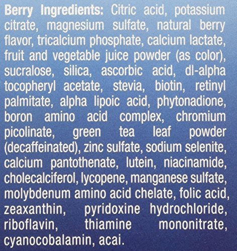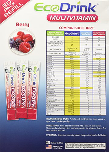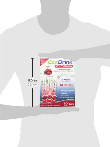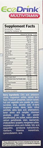 -. Binding : Health and Beauty -. Brand : Eco Drink -. EAN : 0855067001336 -. Feature : Great for the whole family! Our special blend of vitamins and minerals have guaranteed potency and superior absorption with 100% natural flavors and colors. Each serving is 5 times more powerful than leading vitamin water brands, without the sugar and calories. Antioxidants. Nutrients. Electrolytes. Hydration Balanced Energy Also Supports: / Heart Health - With significant levels of Vitamins B6, B12, C, E, Folic Acid, Calcium, and Magnesium, EcoDrink® may help reduce the risk of high blood pressure and heart disease.† Healthy Immune System - EcoDrink® provides the antioxidant protection of Vitamins A, C, E, Selenium, Alpha Lipoic Acid, Green Tea, Lutein, Lycopene, Zeaxanthin and Acai. † Healthy Eyes, Joints and Skin - Our blend of Vitamins A, C, E, Biotin, Folic Acid, Selenium, Lutein and Zeaxanthin helps to keep you looking and feeling your best!† Bone Health - High levels of absorbable Calcium and Vitamin D are important nutrients for maintaining bone health.† †These statements have not been evaluated by the Food and Drug Administration. This product is not intended to diagnose, treat, cure or prevent any disease. Directions: Pour packet contents into 16 ounces of cold water. Shake well and drink! Hint: use less powder for a lighter flavor. Add ice, for best results! Recommended Dose: Adults take 1 packet per day, up to 3 as desired. Children ages 11-18, take 1 packet per day. Children ages 4-10, take 1/2 packet per day. / Supplement Facts: Serving Size: 1 Packet (7.78 g) Amount Per Serving 0 % Daily Value* Calories 0, Total Fat 0 g, Sodium 0 g, 0%, Total Carbs 0 g - 0%, Sugars 0 g, Protein 0 g, 0%, Vitamin A 5000 IU - 100%, Vitamin C 60 mg - 100%, Vitamin D 400 IU - 100%, Vitamin E 30 IU, 100%, Vitamin B12 6 mcg - 100%, Vitamin B7 (Biotin) 300 mcg - 100%, Vitamin K 60 mcg - 75%, Vitamin B1 (Thiamin) 750 mcg - 50%, Vitamin B2 (Riboflavin) 850 mcg - 50%, Pantothenic Acid 5 mg - 50%, Vitamin B6, 1 mg - 50%, Vitamin B9 (Folic Acid) 200 mcg - 50%, Vitamin B3 (Niacin) 5 mg - 25%, Chromium 100 mcg - 100%, Selenium 70 mcg - 100%, Molybdenum 75 mcg - 100%, Magnesium 200 mg - 50%, Manganese 1 mg - 50%, Calcium 300 mg - 30%, Phosphorous 100 mg - 10%, Potassium 400 mg - 12%, Zinc 4 mg - 26%, Alpha Lipoic Acid 20 mg - **, Acai 2 mg - **, Boron 1 mg - **, Green Tea Extract (Decaffeinated) 10 mg - **, Lutein 250 mcg - **, Lycopene 300 mcg - **, Zeaxanthin 100 mcg - **. *Percent Daily Values are based on a 2,000 calorie diet. Your daily values may be higher or lower depending on your calorie needs. **Daily Value not established. / Berry Ingredients: Citric Acid, Potassium Citrate (Potassium), Magnesium Sulfate (Magnesium), Natural Flavor, Calcium Phosphate (Phosphorous), Calcium Lactate (Calcium), Natural Color, Sucralose (0 Calorie Sweetener), Silica, Ascorbic Acid (Vitamin C), Alpha-Tocopheryl Acetate (Vitamin E), Stevia Extract, Biotin, Vitamin A Palmitate, Alpha Lipoic Acid, Phytonadione (Vitamin K), Boron Amino Acid Complex (Boron), Chromium Picolinate (Chromium), Green Tea Extract (Decaffeinated), Zinc Sulfate (Zinc), Sodium Selenite (Selenium), Calcium Pantothenate (Pantothenic Acid), Lutein, Niacinamide (Niacin), Cholecalciferol (Vitamin D), Lycopene, Manganese Sulfate (Manganese), Molybdenum Amino Acid Chelate (Molybdenum), Zeaxanthin, Folic Acid, Pyridoxine Hydrochloride (B6), Riboflavin (B2), Thiamin Mononitrate (B1), Cyanocobalamin (B12), Acai Extract. -. IsAdultProduct : 0 -. Label : Ecodrink -. Manufacturer : Ecodrink -. Model : 11757947 -. MPN : 11757947 -. PackageQuantity : 1 -. PartNumber : 11757947 -. ProductGroup : Health and Beauty -. ProductTypeName : HEALTH_PERSONAL_CARE -. Publisher : Ecodrink -. Studio : Ecodrink -. Title : Ecodrink® Multivitamin Drink Mix 60 Packets - (BERRY Flavor Only) -. UPC : 855067001336