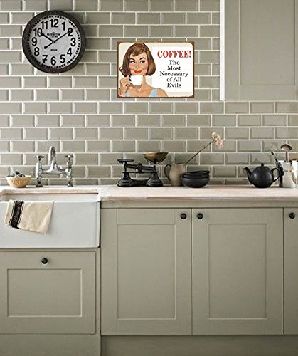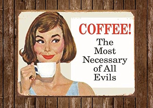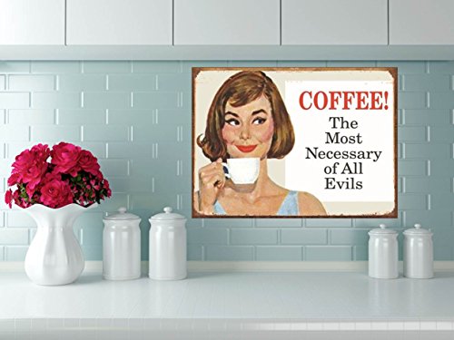 DELIVERS FREE HUMOR TO YOUR HOME/KITCHEN/OFFICE/RESTAURANT/DINER/COFFEE HOUSE: The hilarious graphics and funny quote on this Retro COFFEE! THE MOST NECESSARY OF ALL EVILS sign will bring fun and laughter to anyplace you need a giggle! Looks great in the kitchen, office, restaurant, diner, or coffee house.