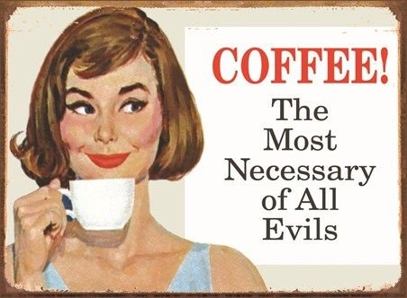 CONVERSATION PIECE: A picture speaks a thousand fold. This COFFEE! THE MOST NECESSARY OF ALL EVILS tin sign will be sure to bring laughter to any conversation.