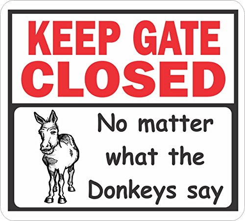 - This ""Keep Gate Closed, no matter what the Donkeys say" sign is screen printed on .06 gage polystyrene. It is 12.75" x 11.50". Rounded corners and pre-drilled holes makes for easy hanging
