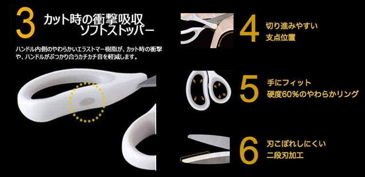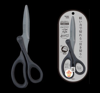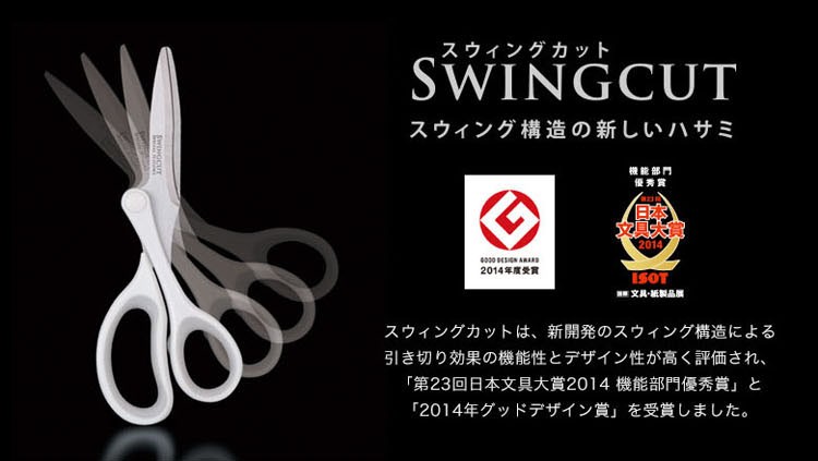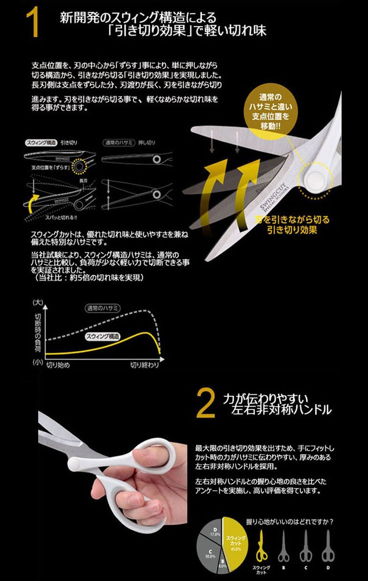 新開発のスウィング構造による 「引き切り効果」で軽い切れ味 支点位置を、刃の中心から「ずらす」事により、単に押しながら切る構造から、引きながら切る「引き切り効果」を実現しました。 長刃側は支点をずらした分、刃渡りが長く、刃を引きながら切り進みます。刃を引きながら切る事で、軽くなめらかな切れ味を得る事ができます。 スウィングカットは、優れた切れ味と使いやすさを兼ね備えた特別なハサミです。