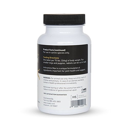 -. Binding : Misc. -. Brand : International Veterinary Sciences -. EAN : 0094008010284 -. Feature : Builds and repairs connective tissue; reduces inflammation and pain / Increases pet mobility and desire for play / Protects pet from further cartilage breakdown / Suitable for all dog sizes; tablets can be broken in half for smaller dogs / Made in the USA -. Label : International Veterinary -. Manufacturer : International Veterinary -. Model : 01028 -. MPN : 01028 -. PackageQuantity : 1 -. PartNumber : 01028 -. ProductGroup : Pet Products -. ProductTypeName : PET_SUPPLIES -. Publisher : International Veterinary -. Studio : International Veterinary -. Title : International Veterinary Sciences 60 Count Arthramine Max Complete Glucosamine, Chondroitin and Hyaluronic Acid, Bone and Joint Performance Supplement for Dogs -. UPC : 094008010284 -. Warranty : N/A