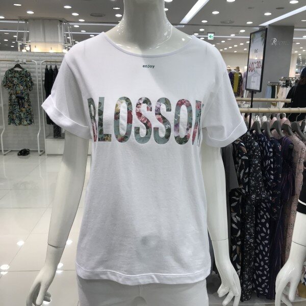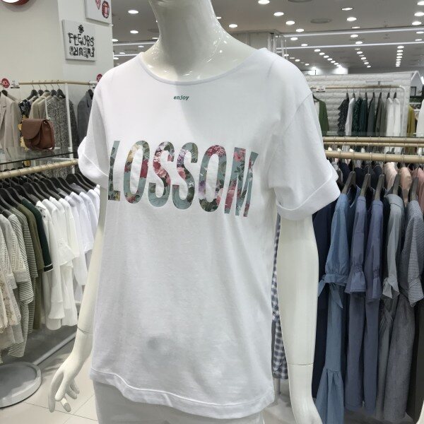 프린트된 레터링글씨로 화사하게 처리되어있습니다뒷부분 장식으로 포인트를주었어요소매는롤업 되어있는스타일입니다