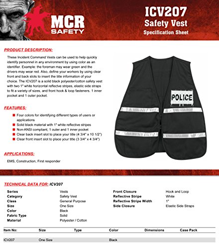 MCR Safety ICV207 Incident Command Polyester/Cotton Safety Vest with 1-Inch White Reflective Stripe, Black
