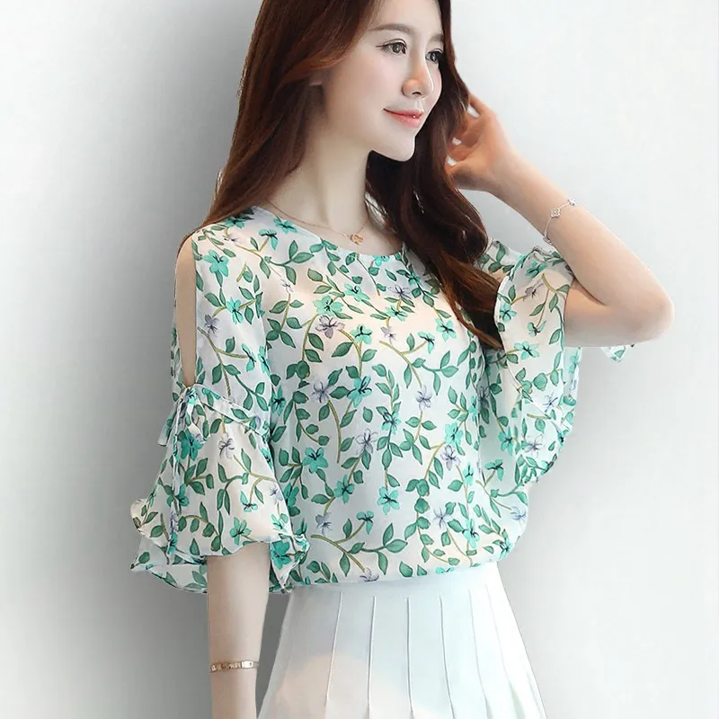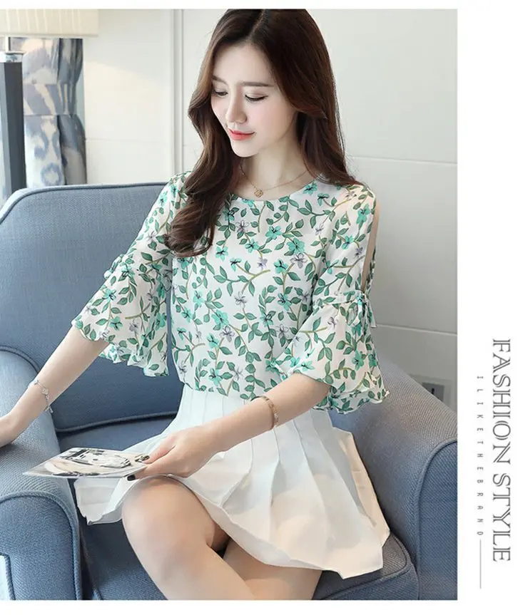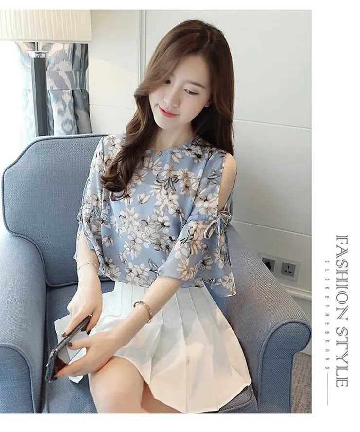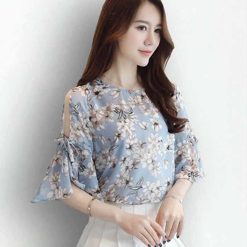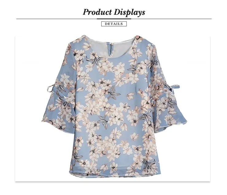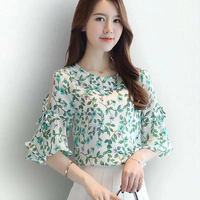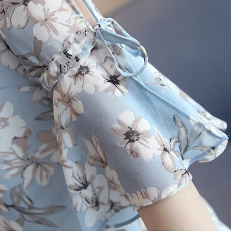 :2018 Chiffon Floral Print Blouses For Women Ladies Fashion O-Neck