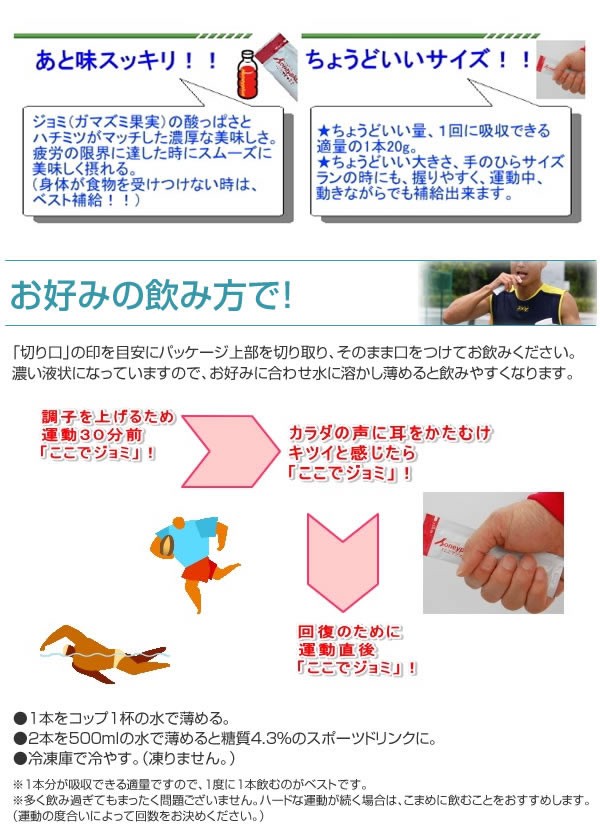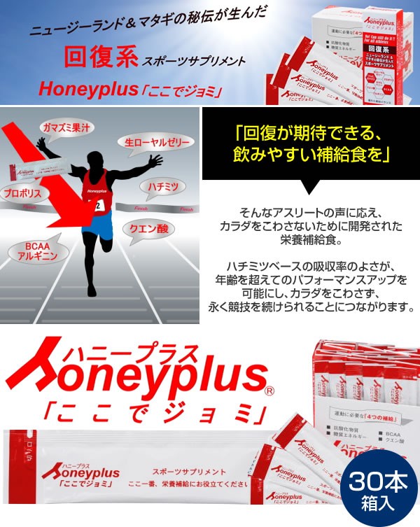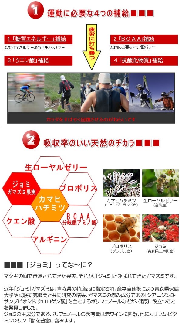 | 筋肉や体に必要な栄養素とエネルギーの両方を素早く補給するスポーツサプリ!ニュージーランド産カマヒハニーと「ジョミ」(ガマズミ果実)の恵み。天然成分のスーパー栄養バランス!アスリートからスポーツ愛好者、ウォーキングなどを楽しむ方のために! |