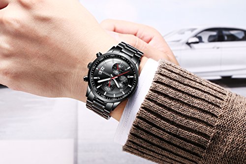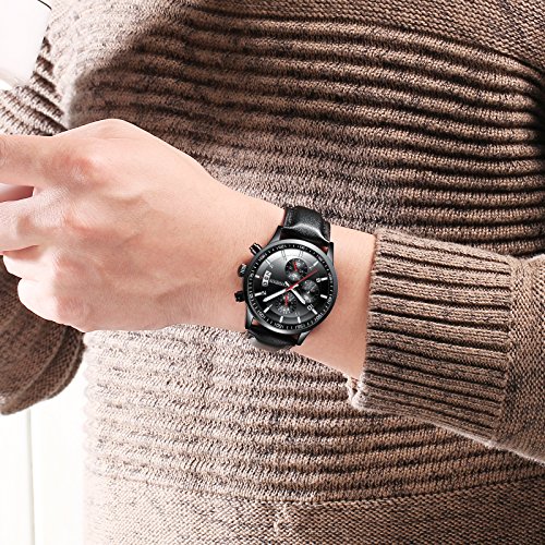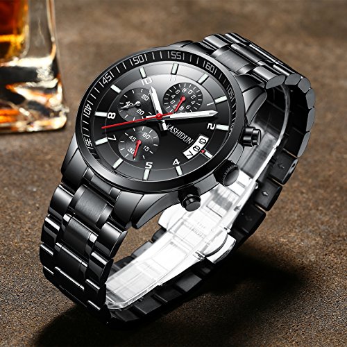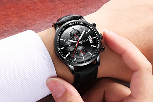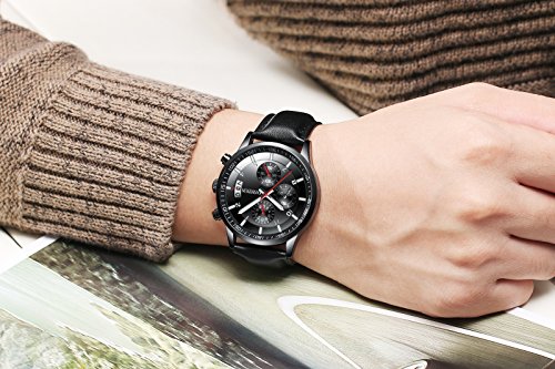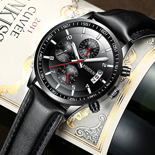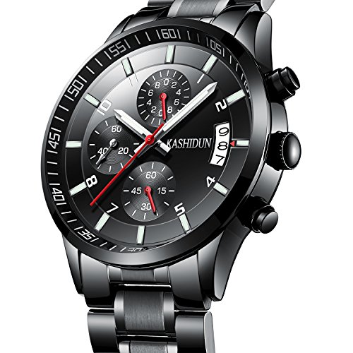 -. Feature : Durable mineral crystal screen scratch-resistant, Japanese quartz movement / Date window(3 o'clock), Muti-functional features(Chronograph, 60-minute and 60-second sub-dials) / Stainless steel case, Genuine Leather strap with hook-buckle closure / Steel band with double push hidden clasp / 30M water resistant, withstands rain and splashes of watet but no swimming or showering / Gift Idea: Sports Watch is a great gift choice to your loved ones for Christmas, birthday, anniversary, Mother's Day, graduation and Valentine's Day, Or as a business and party present; If you have any questions, Please feel free to contact KASHIDUN After-sale Service Email: kashidun.ur@hotmail.com