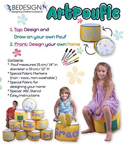 Studio : Bedesign Studio Publisher : Bedesign Studio Binding : Toy Product Description Artpoufie - craft my first personalize pouf kit, includes everything your child needs to create their own personalize unique pouf! its the perfect craft kit: on one side of the pouf - simply cut out the letters of your name and on the top of the pouf - draw freely with the special fabric markers on the poufi fabric to complete the look. Artpoufie - craft my first personalize pouf kit is recommended for children age 2 and up (adult supervision required). The pouf color is yellow with pink. The special fabric for designing your own name color green. 0