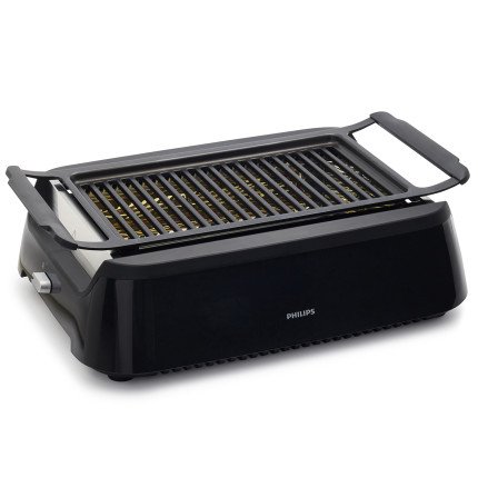 Philips indoor Smoke-less grill is a unique appliance that allows you to enjoy tasty, evenly browned grilled food all year round. The advanced infrared heat technology ensures for up to 80% less smoke and minimal splattering. The advanced infrared technology and the special reflectors guide the heat towards the grid achieving delicious, evenly grilled food, while leaving the grease tray cool enough to minimize unpleasant smoke and grease splattering. As fat and water content differ per food type, grilling some ingredients (beef and chicken) results in hardly any smoke, while with others (pork or lamb) there can be slightly more- yet much less than with current grills.Feature
