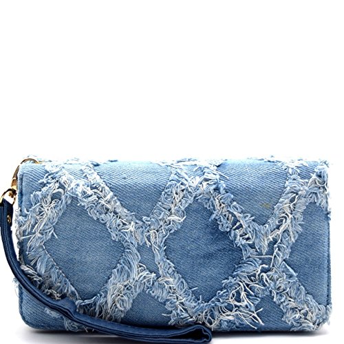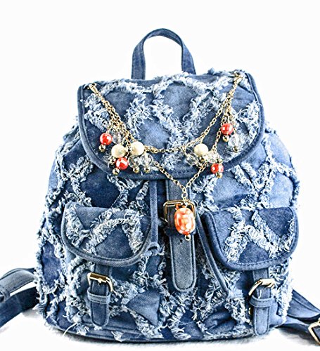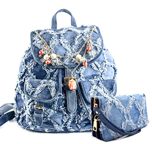 -. Title : Ruby Frayed Denim Backpack w/ Charm + Wristlet Wallet- Blue
