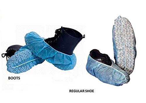 Easy On, Easy Off! Our Disposable Boot and Shoe covers slip easily over shoes and are one-size-fits-all covering most shoes up to size 13. Each package includes 100 blue polypropylene shoe covers (50 pairs) that will protect and cover your shoes and work boots.