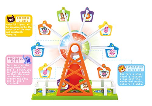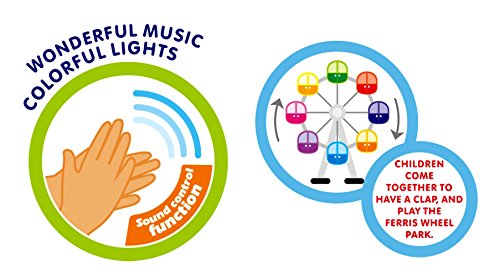 Adorable and entertaining Ferris Wheel with fun musical sound and brightly colored lights. If your child loves the ferris wheel or like watch them, this will be a definitely be a great toy for them to play with. The ferris wheel has awesome sound control, so once you start clapping your hands, the ferris wheel will start rotating and playing music. There are 4 different musical tunes, that kids can dance to! Even comes with animal printed on the cart for even more excitement.Feature