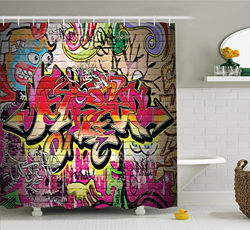 Rustic Home Decor Shower Curtain by Ambesonne, Graffiti on Wall Urban Street Art with Spray Paint Tagger Underground Theme, Fabric Bathroom Decor Set with Hooks, 70 Inches, Multi