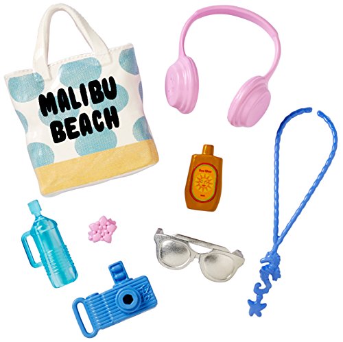 Barbie doll has the best accessories! This accessory pack is themed with eight versatile pieces to help tell all kinds of beachy stories. The pastel-colored pieces include summery fashion items like silvery sunglasses, an ocean blue beach-inspired necklace and trendy pink headphones. Theme-specific accessories add to the storytelling fun with items like a camera, water bottle, suntan lotion and beach bag. Young imaginations will love finding the perfect pieces that fit their style and tell their stories (each sold separately, subject to availability) -- because with Barbie, you can be anything! Pack includes eight accessories for Barbie dolls of all body types; doll not included. Colors and decorations may vary.Feature