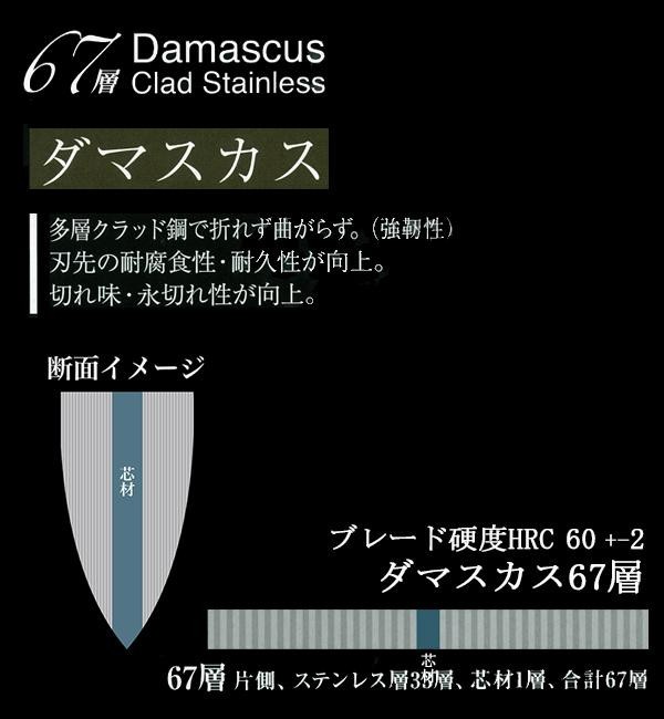 | 素材・材質 | ブレード/芯材:C1.0CMV多層クラッド複合材(コバルト・モリブデン・バナジウム含有)、側材:18-0ステンレス鋼 口金・エンドキャップ:18-0ステンレス鋼 ハンドル:積層強化木 |