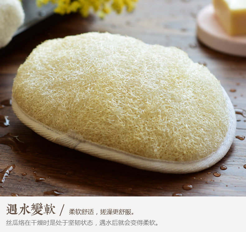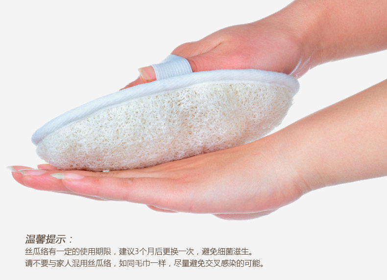 丝瓜络在干燥时处于坚韧状态,遇水就会变得柔软。 初次使用时,请在丝瓜络表面涂上沐浴液,然后按摩揉搓皮肤更舒爽。 温馨提示