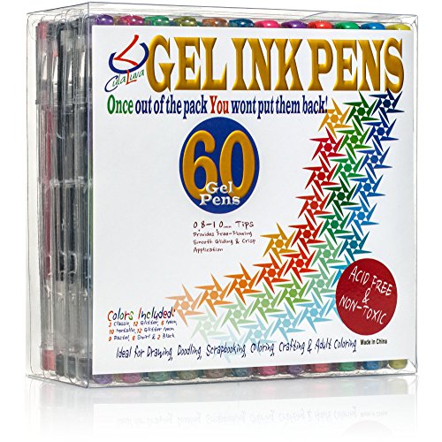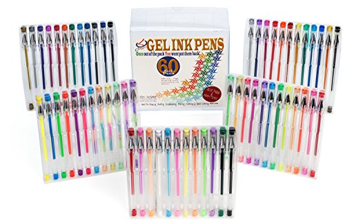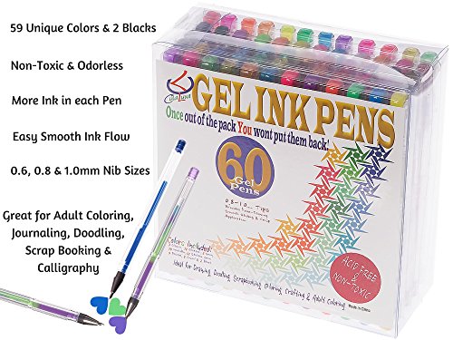 -. Title : CulaLuva Gel Pen Set of 60 Top Quality Gel Ink Pens Unique colors for Adult Coloring Books & journaling Stored in own PVC Pen Case
