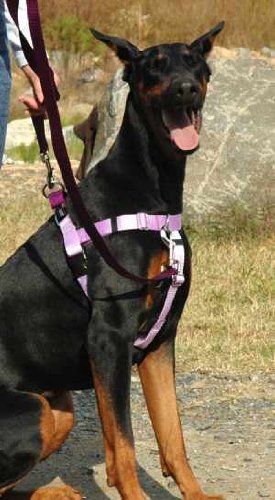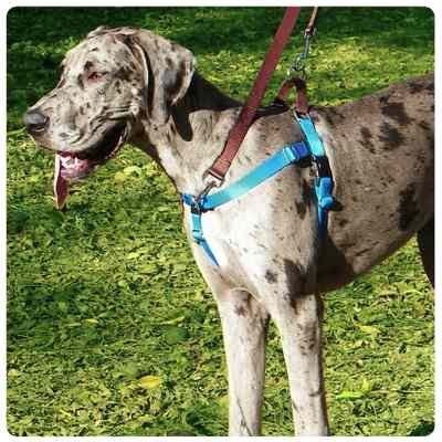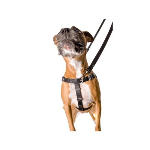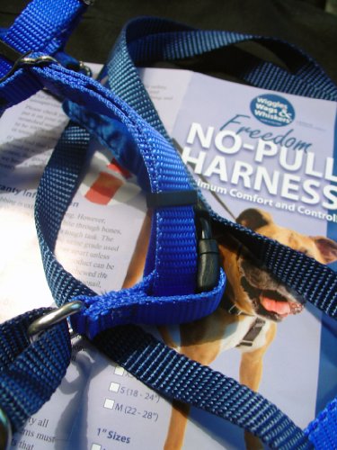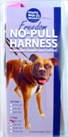 The Wiggles Wags Whiskers patented Freedom No Pull Training Package has everything you need to train your dog to walk easily on a leash. Constructed of industrial strength nylon webbing with reinforced X-stitching, it provides you with the security of knowing this harness will stand up to daily use by even the strongest dogs. The training package includes: 1. The Freedom No-Pull Harness -- the ultimate training tool, featuring a martingale loop on the back of the harness, to tighten slightly around your dog's chest and discourage pulling - and a connection in the front that allows you to redirect attention back to you. 2. A Coordinating Training Leash which can connect to the front and back of the harness simultaneously, or to the back of the harness and a collar at the same time, for additional control. 3. Training instruction brochure. 4. Fitting instructions and Warranty Information. The harness has a contrasting loop (which can be seen in the photos) to make it easier to put on and take off. Sizing information: Use a soft tape measure (tailor's tape measure) or a piece of string or ribbon, mark the measurement around the chest and then measure the string from the end. Chest and neck measurements and weight recommendation: X-Small: Chest - 14"-20"; Neck - 10"-14"; Weight - 12-17 lbs. Small: Chest - 18"-24"; Neck - 10"-14"; Weight - 18-25 lbs. Medium (5/8" width): Chest - 22"-28"; Neck - 14"-18"; Weight - 25-40 lbs. Medium (1" width): Chest - 22"-28"; Neck - 14"-18"; Weight - 40-65 lbs. Large: Chest - 26"-32"; Neck - 16"-20"; Weight - 60-85 lbs. X-Large: Chest - 30"-38"; Neck - 20"-26"; Weight - 85-140 lbs. 2X-Large: Chest - 36"-44"; Neck - 26"-34"; Weight - 140-250 lbs. 0 |