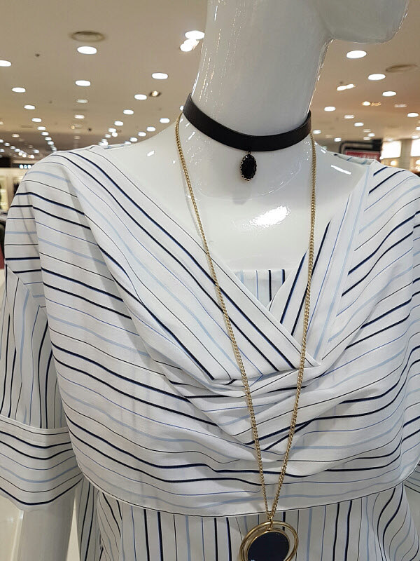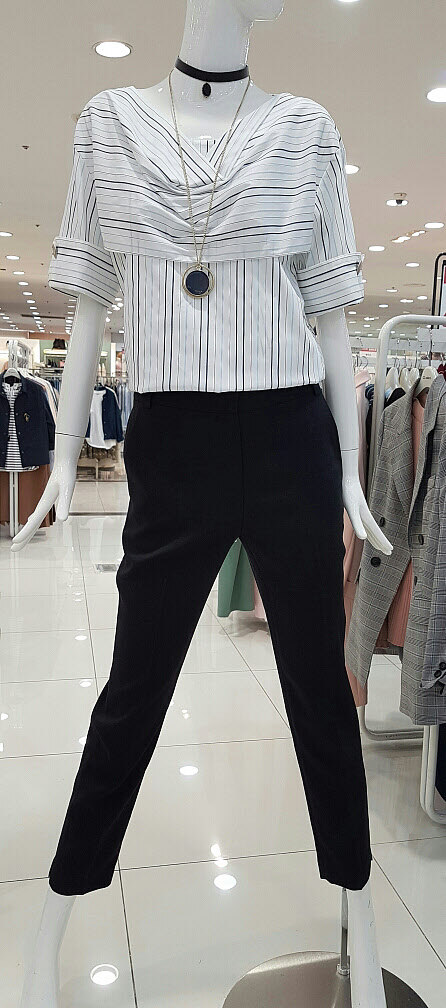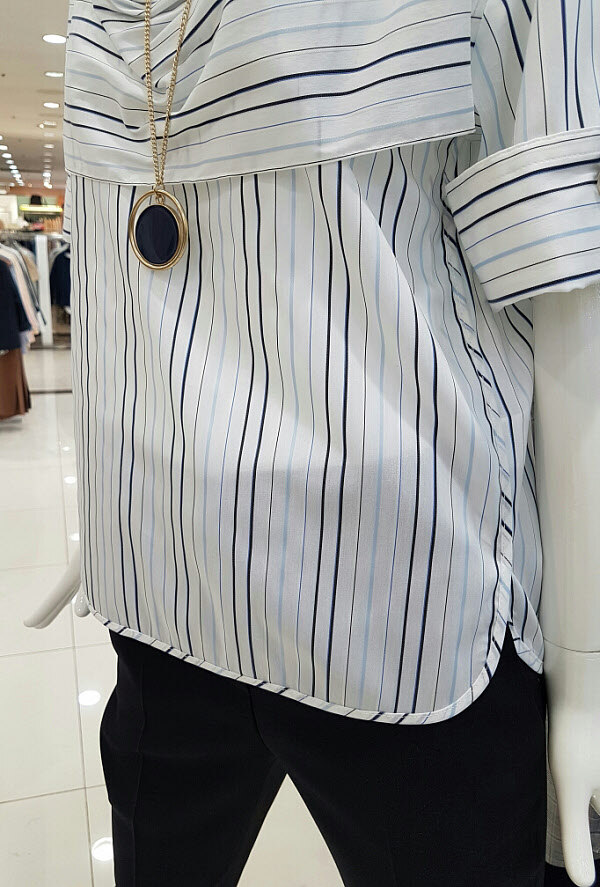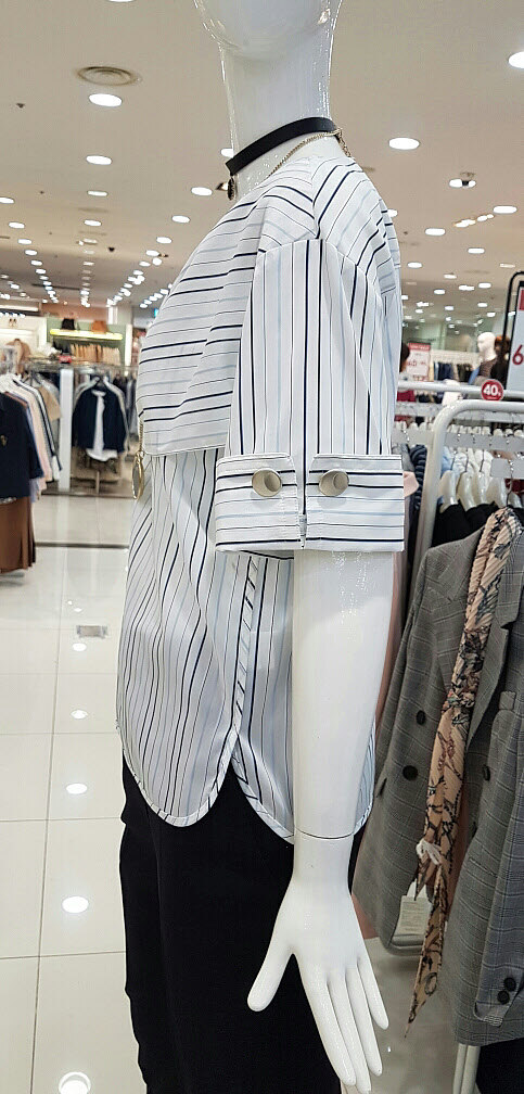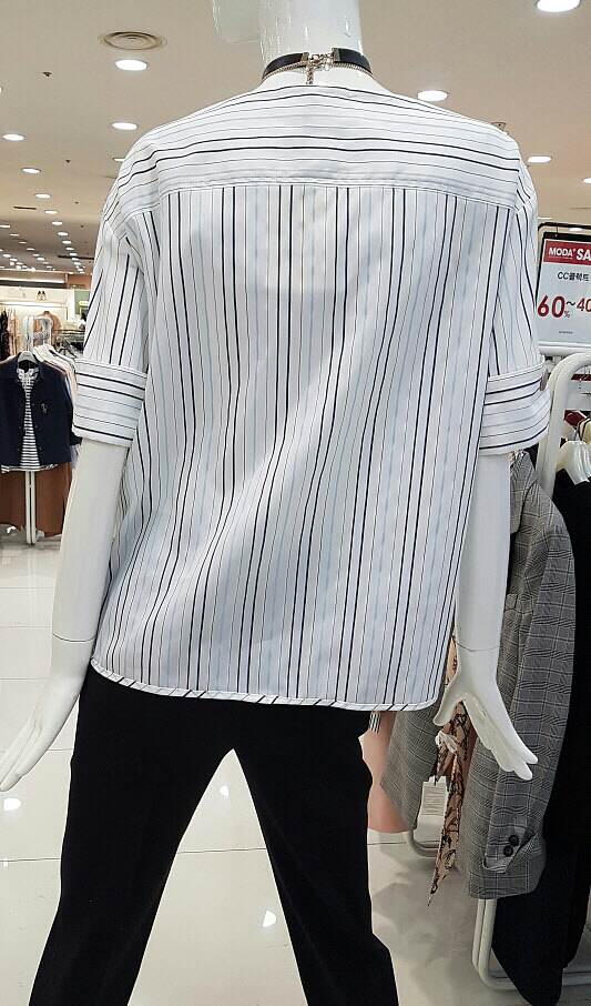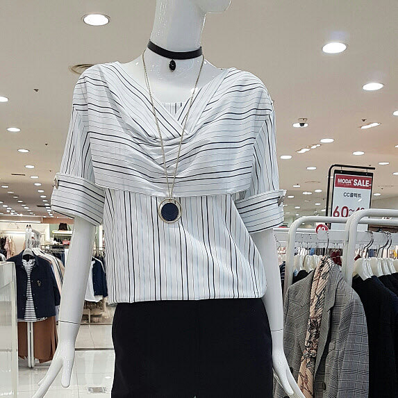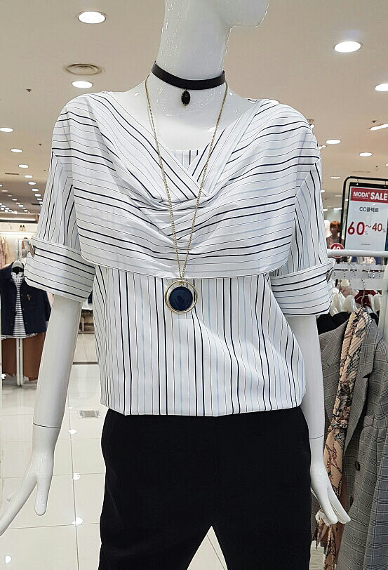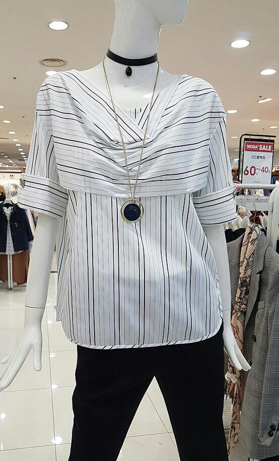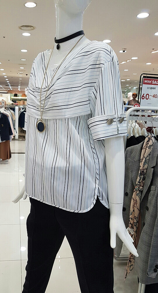 CC collect 깔끔 배색스트라이프에 매력적인 목선이네요좁지않은V라인은 제~목선이 길어보이구요 루즈핏에 앞~덧단은 상체통통 고객님 ~날씬 하다고~~좋아하시네요세련에~시크~도시녀로 변신굿~~^^
