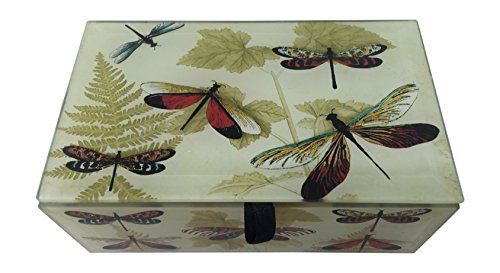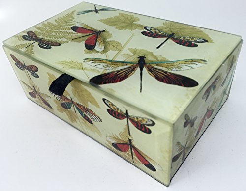 - Beautiful beveled glass jewelry box features a collection of dragonflies with a cream background.