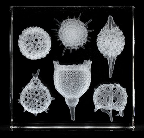 -. Feature : FIRST 3D Laser Scans of Microscopic Radiolarians / Using high-frequency lasers driven by hand-tooled software, this optically clear glass cube boasts highly-detailed, laser 3D renderings of six greatly magnified free-floating plankton: Acrosphaera trepanata, Heliodiscus echiniscus, Stylatractus cronos, Actinomma popofskii, Anthocyrtidium ophirense, and Ceratospyris hyperborea / Measuring 3.5" x 3.5" x 1.75", this exclusive glass collectible is delivered in a fabric-lined case. / Radilarian replicas are 1:300 scale. / Best viewed against a dark backdrop, we highly recommend the separate purchase of the lighted base (with 4 built-in LEDs) for optimal display.