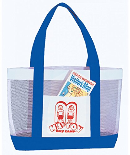 -. Feature : Mesh Tote Bag / Size - 19 W x 12 H x 4-1/2 D in. / Color - White W/Royal / Material - 600D polyester with nylon mesh / Case of 48