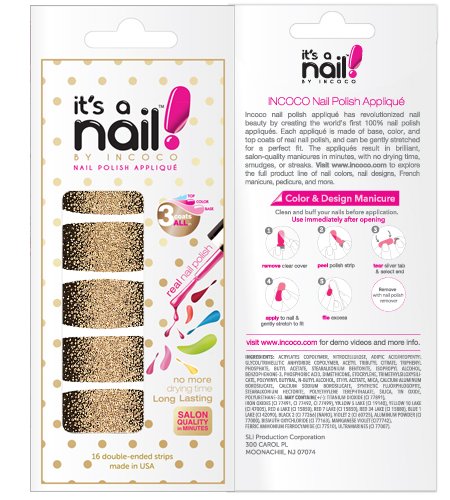 THE PERFECT MANICURE IN MINUTES! Incoco has revolutionized nail beauty by creating the world's first 100% real nail polish appliques! Each applique is made of a base, color and top coat of real nail polish. These appliques are flexible and can be gently stretched to easily fit any nail size and shape. The result is a brilliant, salon-quality manicure in minutes with no dry time, smudges or streaks.Feature