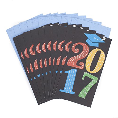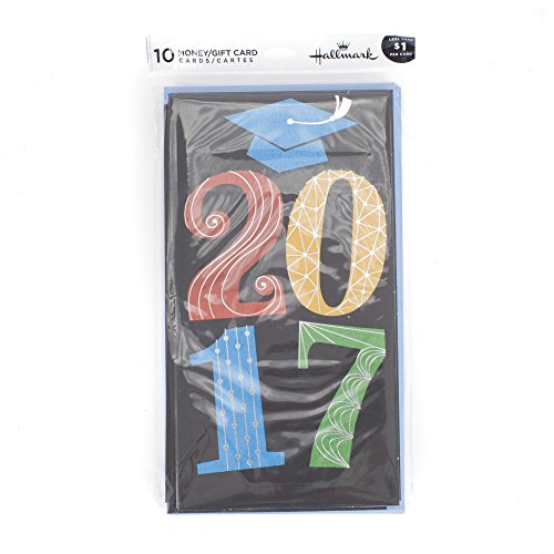 This set includes 10 cards and 10 envelopes with the design featuring "2017" in bold, colorful letters with silver foil accents and a special place inside for gift cards or money.