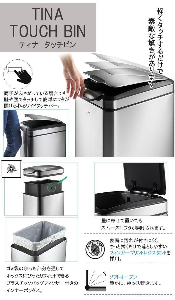 | 両手がふさがっていても腿や腰で軽くタッチして簡単に開けられるワイドタッチバーのゴミ箱。壁に寄せて置いてもスムーズにフタが開けられる構造です。スタイリッシュなデザインでどこに置いても様になるゴミ箱です!! |