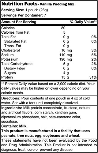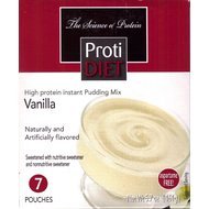 ProtiDiet Protein Instant Pudding Mix 7 Servings Per Box Flavors Chocolate, Vanilla. Creamy ProtiDiet protein puddings from Pro-Amino are designed for any healthy diet or weight loss plan. Each serving is only 80-90 calories, with 15 grams of protein and 40 of the daily value of calcium. These protein puddings make a healthy and delectable snack or dessert any time of day. Aspartame free.