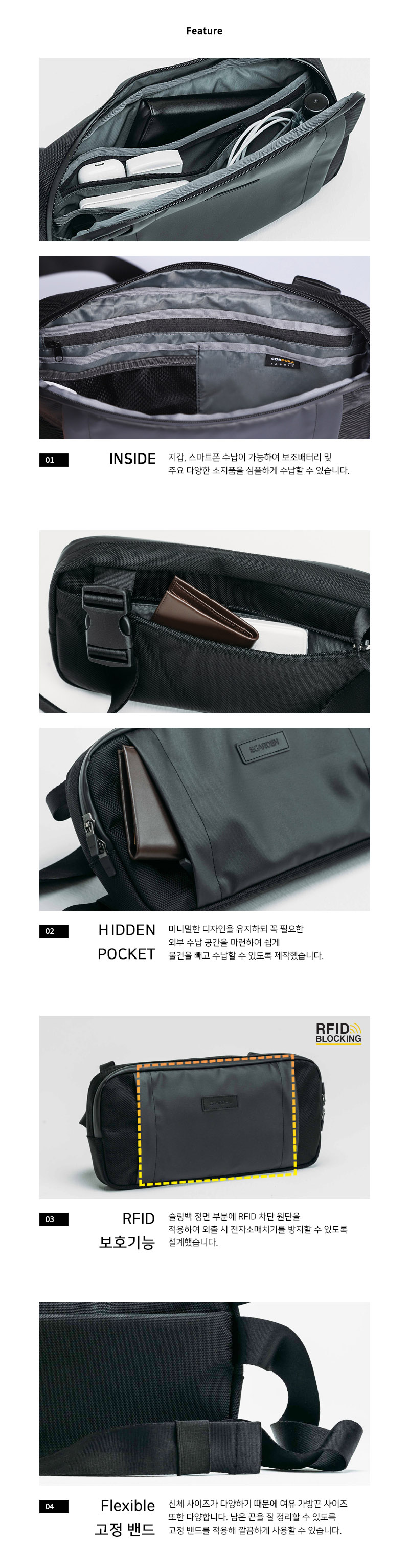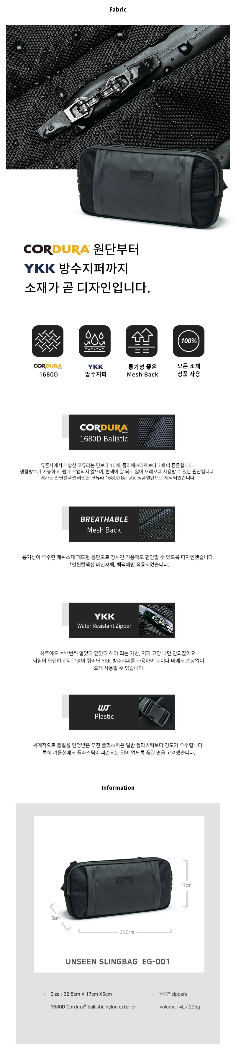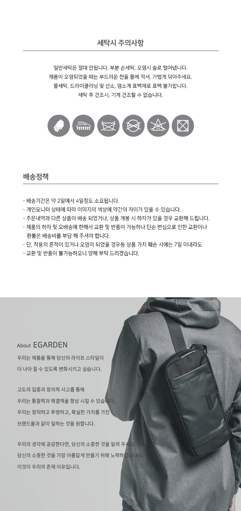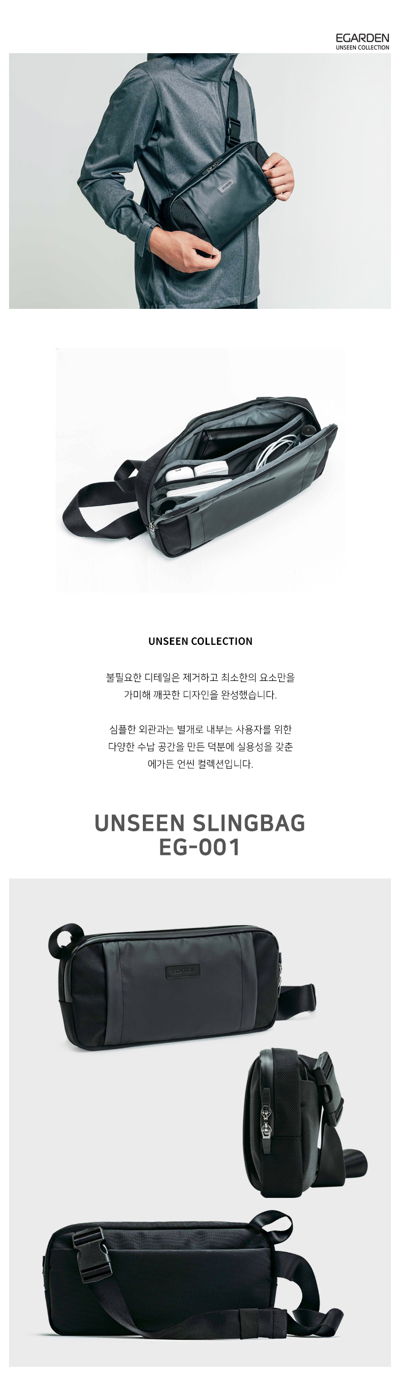 | UNSEEN COLLECTION : 불필요한 디테일은 제거하고 최소한의 요소만을 가미해 깨끗한 디자인을 완성했습니다. 심플한 외관과는 별개로 내부는 사용자를 위한 다양한 수납 공간을 만든 덕분에 실용성을 갖춘 에가든 언씬 컬렉션입니다. 스마트폰과 지갑을 가볍게 수납하는 UNSEEN SLINGBAG EG-001 언씬컬렉션 슬링백은 앞, 뒤 편하게 착용할 수 있으며, 전면 2곳은 쉽게 꺼낼 수 있는 지갑, 스마트폰 수납이 가능하여 메인 수납 공간에 보조밧데리 및 주요 소지품을 쉽게 수납할 수 있도록 디자인했습니다. 특히, 뒤쪽 히든 포켓은 중요한 여권이나 소지품을 보관할 수 있습니다. |