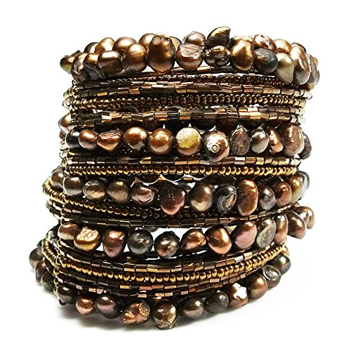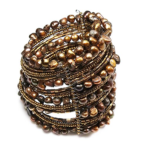 -. Feature : Material: Natural stones, Beads, Rhodium plated wire / Stone: Cultured freshwater pearls (dyed) / Cuff Width: 65 mm (2.56 in) wide | Length: 7 in (adjustable) / Color: Brown | Weight: 82.2 grams / Style: Handmade, Bracelet | Clasp Type: Open ended, Wrap