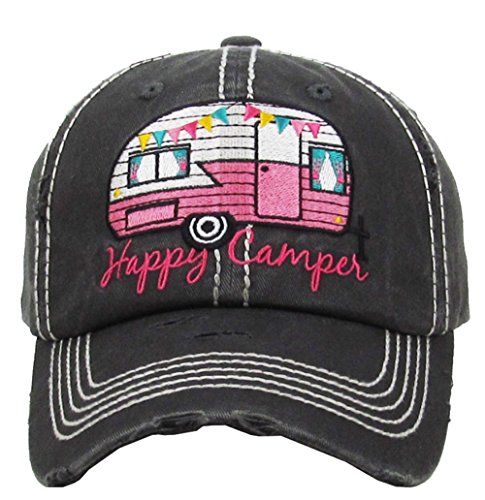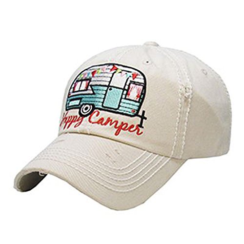 Binding : Apparel Product Description Campers will love this ball cap. Hat is distressed, vintage style, washed color, with adjustable strap back. Embroidered camper on the front with "Happy Camper" embroidered underneath. So cute and perfect for the nature loving lady in her RV!! 0