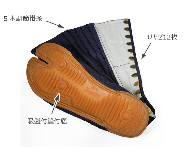 丈夫な樹脂製先芯入りでつま先をしっかり守ります!!コハゼ12枚で5本調節掛糸があり、吸盤付縫付底を使用しているので、フィット感とグリップ力も抜群。 |