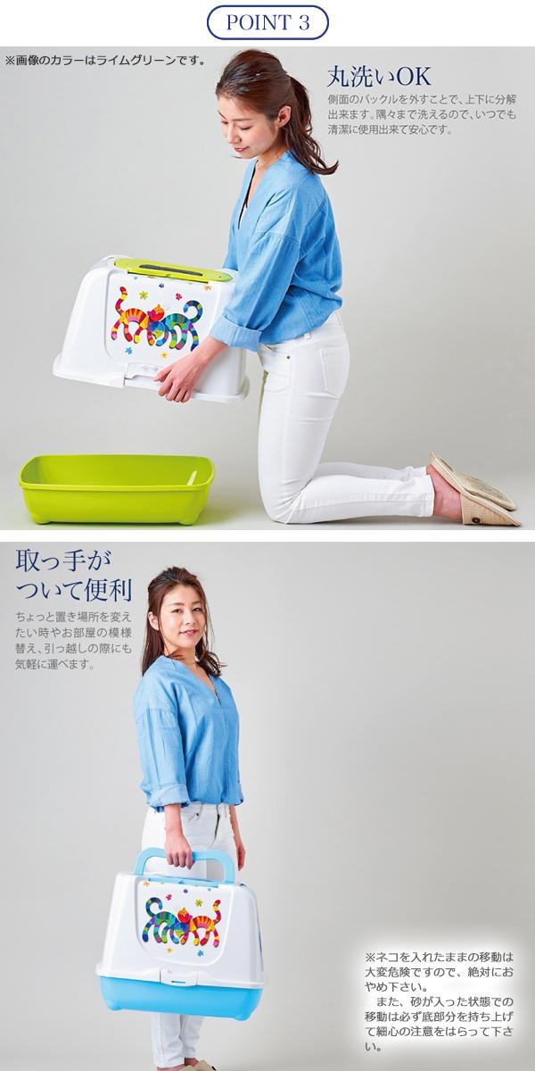 ボディ表面に模様が入ったインテリア性の高いネコトイレです。フード付きで更に扉もついているので、砂やニオイが漏れにくくなっています。側面のバックルを外すことで、上下に分解して丸洗いも出来ます。 |