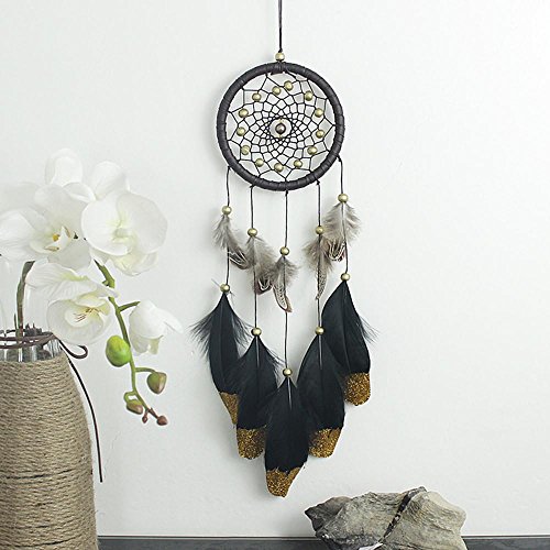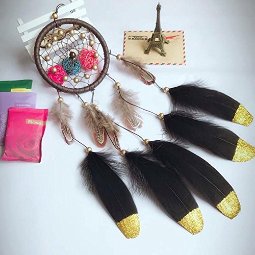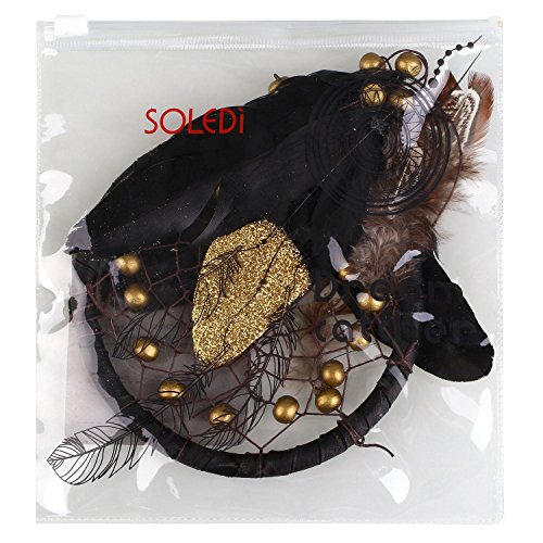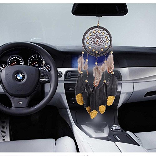 Soledi Dream Catcher Golden Black Feather Brown Feather Golden Bead 1 circle Indian Dreamcatcher Wall Hanging Decoration Ornament Gift Small Size Suit for Car Dec (Black Golden)