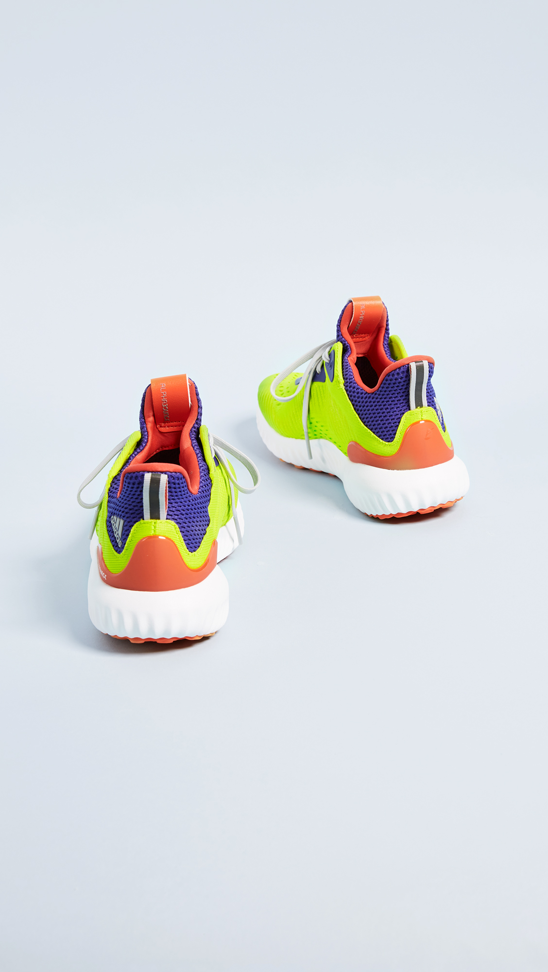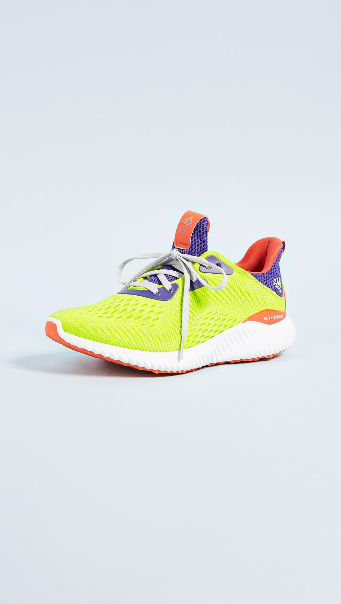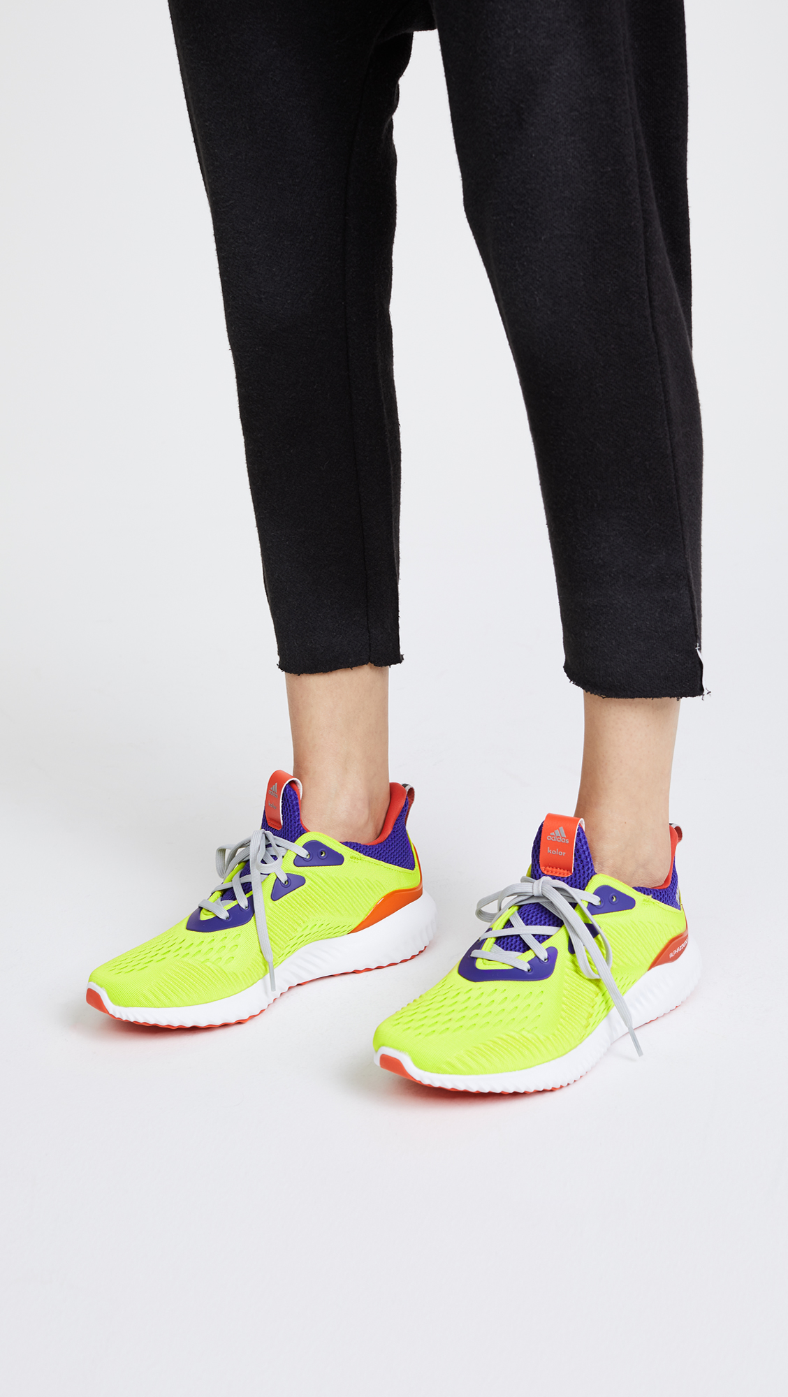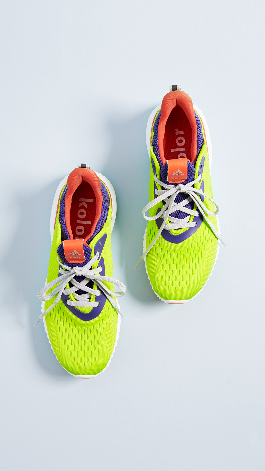 Part of the adidas x Kolor collaboration, these neon Adidas sneakers are crafted in a breathable knit fabric. Boost sole technology provides lightweight cushioning and comfort. Logo lettering at the protective heel cap. Lace-up closure.
