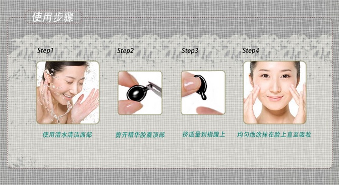 Wash face, cut the capsule and gently apply on the face and neck, massage till fully absorbed.