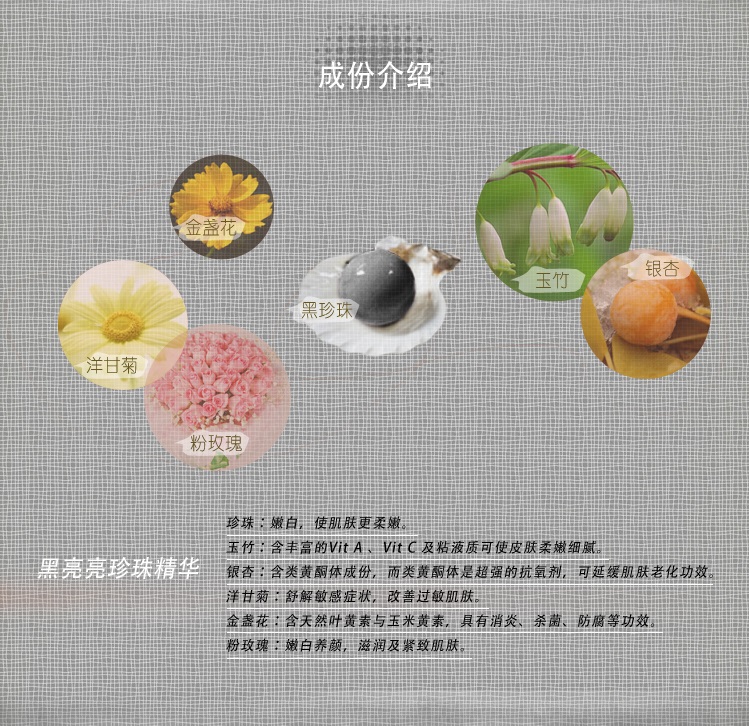 Ingredients: Nanometer Powder, Black Pearl Powder, Hight concentration Aloe Vera, Polygonatum Odoratum, Ginkgo, Chamomile, Calendula, Pink Rose.