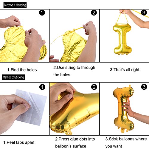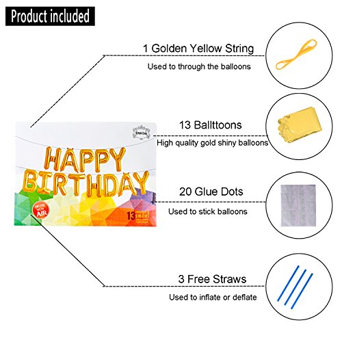 -. Feature : ★ EASY TO INFLATE: these 13 balloons are auto-seal making inflate so much easily / ★ NO NASTY SMELL & REUSABLE: balloons are made of high quality aluminum foil and through stick quality inspection so they are reusable and perfect / ★ FOR ALL AGES & OCCASIONS: for kids girls boys adults' birthday party decoration and can be hung on the wall,taped to the wall and window / ★ PACKAGE: 13 independent shiny golden alphabet balloons,3 free straws,20 free glue dots / ★ SATISFACTION GUARANTEED: 30-day money back and 24-hour customer support
