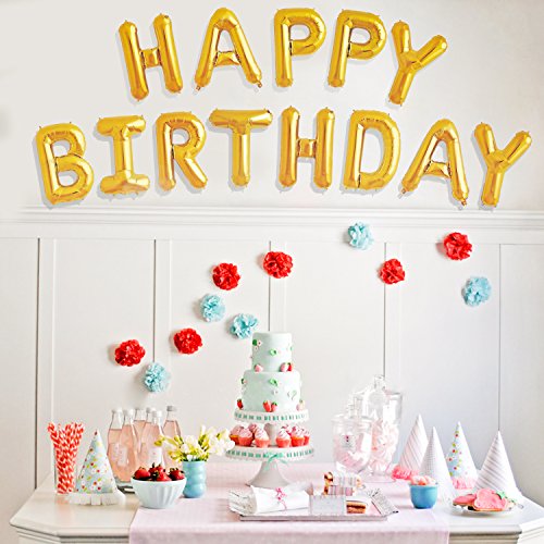 -. Title : Happy Birthday Balloons Banner - Gold Mylar Foil Letter Balloons for Kids Girl Adult Baby 1st 2nd 3rd Birthday Party Decoration With 13 Balloons HAPPY BIRTHDAY,3 Free Straws,Free Glue Dots,Reusable