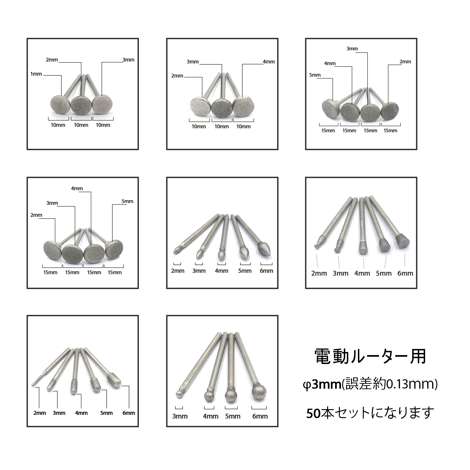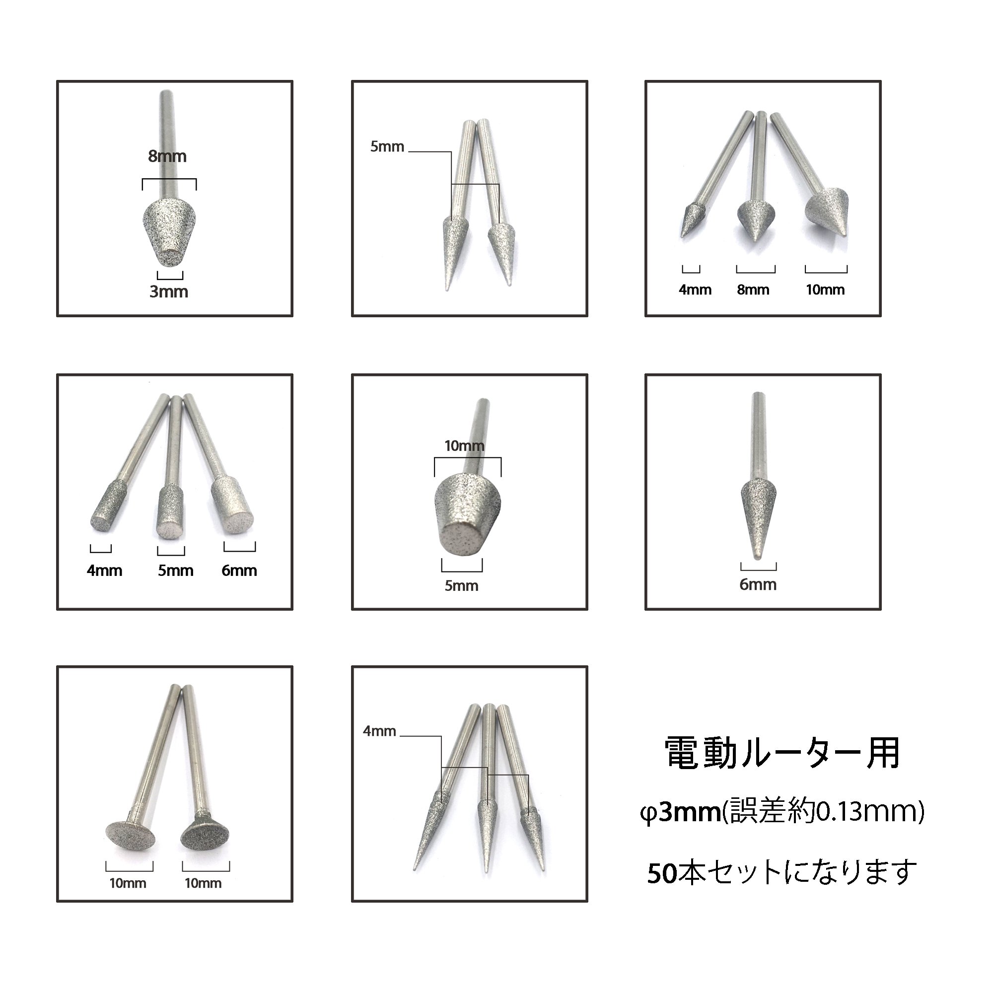 Size: 50 for Electric Router φ 3 mm (1/8 ") 50 pieces will be available.I can also handle hard materials such as Titanium coating, Metal · Glass, etc. Diamond abrasive bit is used.